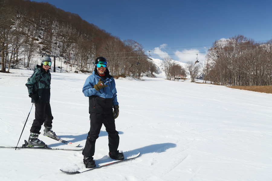 ニュージーランドからのお父さん(写真右)が「日本に4週間滞在しています。五竜47には初めてやって来ました。次男はスキー自体が今日が初めてで、カメラの前まで辿り着けませんでしたw」とお話しくださいました(※お隣はご長男さんです)。ルート5とルート6(写真)はシャラッとしたザラメ雪の圧雪でした。