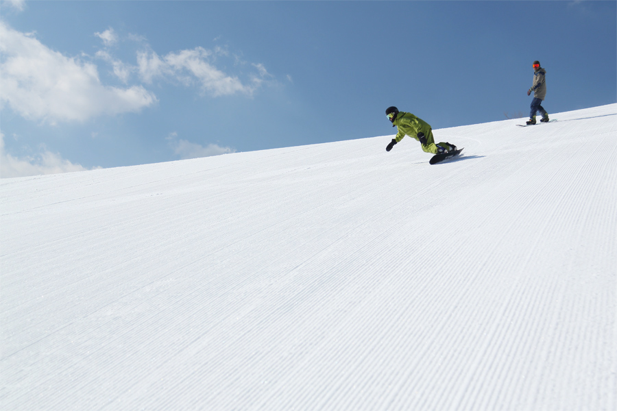 上空の雲の流れは速かったですが、ゲレンデでは風が弱く吹く程度でした。平日ながら来場者の出足が早くて、7時半頃に第1駐車場が満車になり、取材後となる10時頃の第2駐車場は9割方が埋まっていました。グランプリコース(写真)はシャラッとした滑りやすいザラメ雪の圧雪でした。