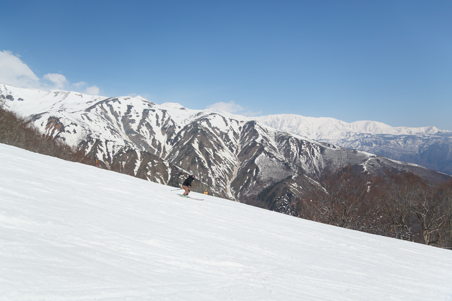 適度に締まったザラメ雪の圧雪のパノラマコース(写真)とルート8上部ではエッジを効かせて思い通りのターンを繰り返せました。パノラマのスキーヤーズレフトには4/4(土)~4/5(日)開催の「WORLD MOGUL CAMP 2026 HAKUBA」に向けてコース規制が。スタッフさんが「約60名が参加して4/4(土)にレッスンとワークショップ、4/5(日)に大会を行います。」とお話しくださいました。