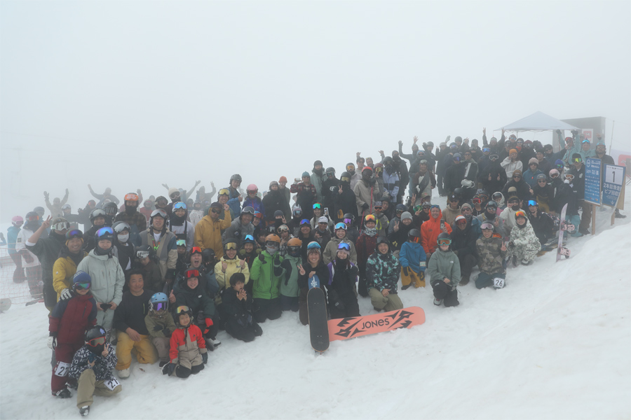 スキー、スノーバイク、親子の各部門が加わった今回には約330名ものエントリーがありました。9時の開会式(写真)のあと、9時20分からコースインスペクション、10時20分からパトロール2名とミラノ・コルチナパラリンピックのスノーボード日本代表の岡本圭司選手の前走が行われ、スノーボード部門の女子ジュニアの1本目が始まりました。