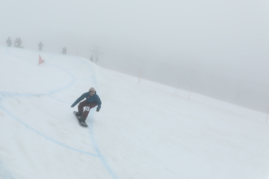 8時半頃に見られた青空はその後高度を上げて来た雲に飲み込まれて行きました。ガスが濃淡を繰り返す中、シャラシャラに緩んだザラメ雪は若干板が走りにくい雪質。スピードを落とさないようにしっかりバンクに当て込んで滑るベテラン選手の姿が印象に残りました(写真はリラクゼーションサロン Chill Life の坪井オーナー)。