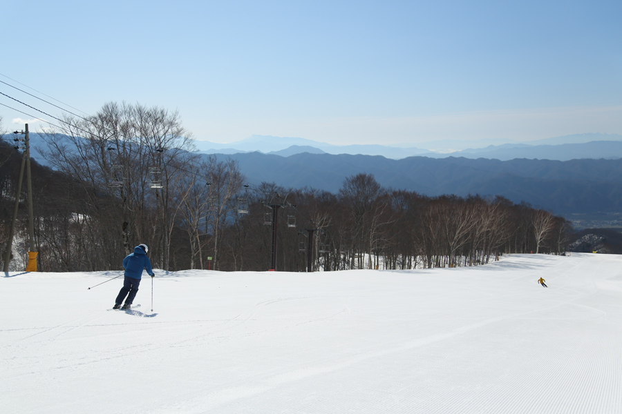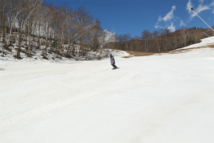 ハンの木の中盤以降にはコースの約3分の2の幅で圧雪が入っていました。「終盤はストップ雪でしたね。」と小谷村在住の女性(写真)のおっしゃるようにハンの木終盤は雪面の汚れが目立ち板が走りづらかったです。右奥に見えるところで一度雪が途切れたあと、ゴンドラ中間駅の手前から500mほど歩くことになります。そんな訳で、取材中に滑り降りて来るのは数人でした。
