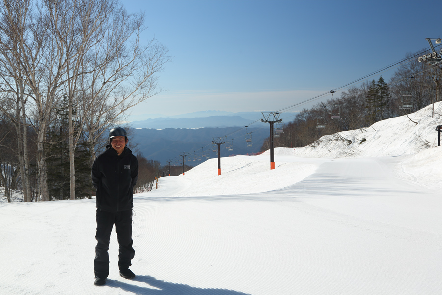 ゴンドラ山頂駅のスタッフさん(写真)が「昨日のこのあたりは終日ガスに包まれていましたが、バンクドスラロームの大会もあって大賑わいでした。今日は気温がさらに上がりそうですね。」とお話しくださいました。わずかに吹く南風が心地よく感じられる朝でした。