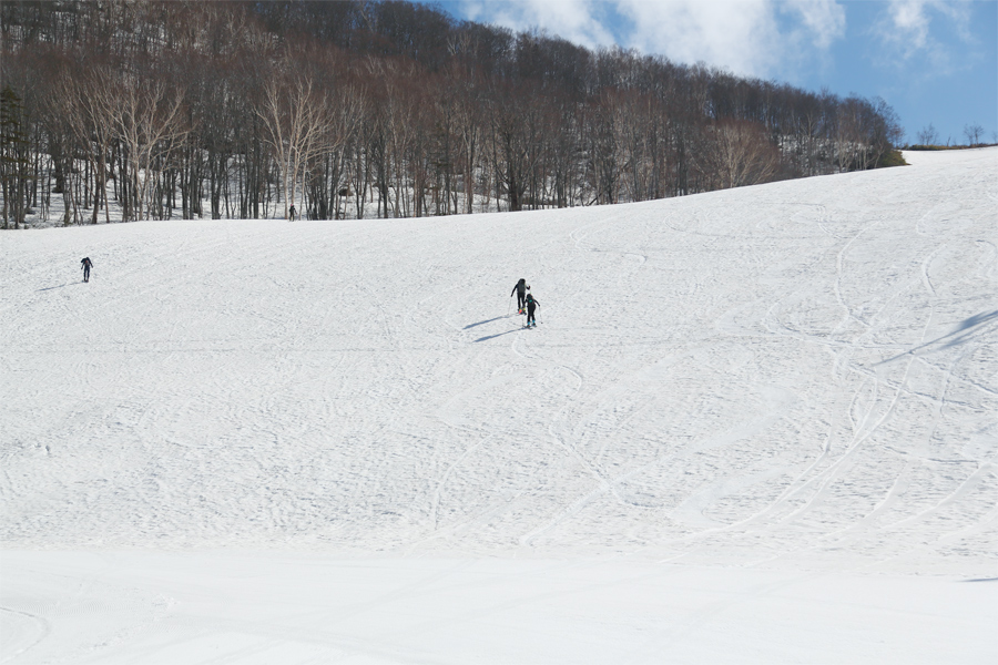 つがいけロープウェイが月曜~木曜に運休するため、晴天日にはクローズ中の栂の森ゲレンデ(写真)を登ってバックカントリーへ向かう姿をよく見かけます。お会いした愛知県からのスキーヤーさんが「たまに見ています。今日はハイクアップして栂池自然園をぐるっと回って来ます。」とお話しくださいました。