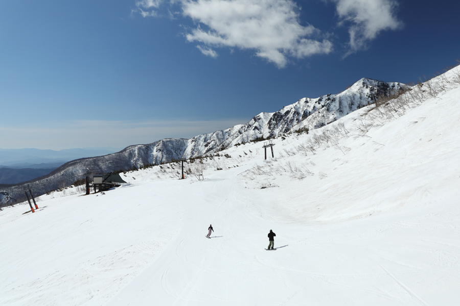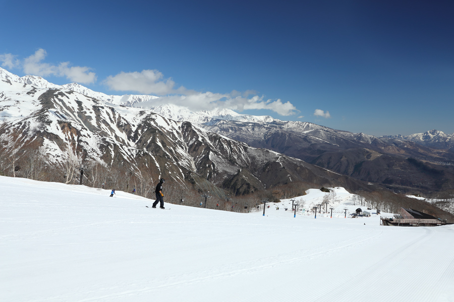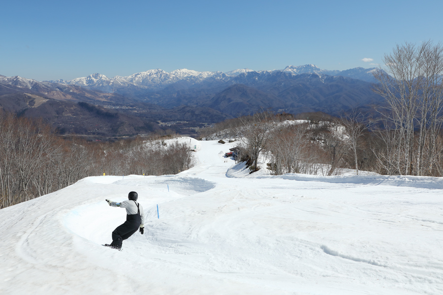 空気も景色も、いかにも春スキーシーズンらしい晴天に。リフトマンさんが「今日は暑くなりそうですね!」とお声掛けくださいました。ザラメ雪のグランプリコース(写真)は非圧雪部分に雪の汚れが見られましたが、圧雪部分は白くて板が走る好コンディションでした。