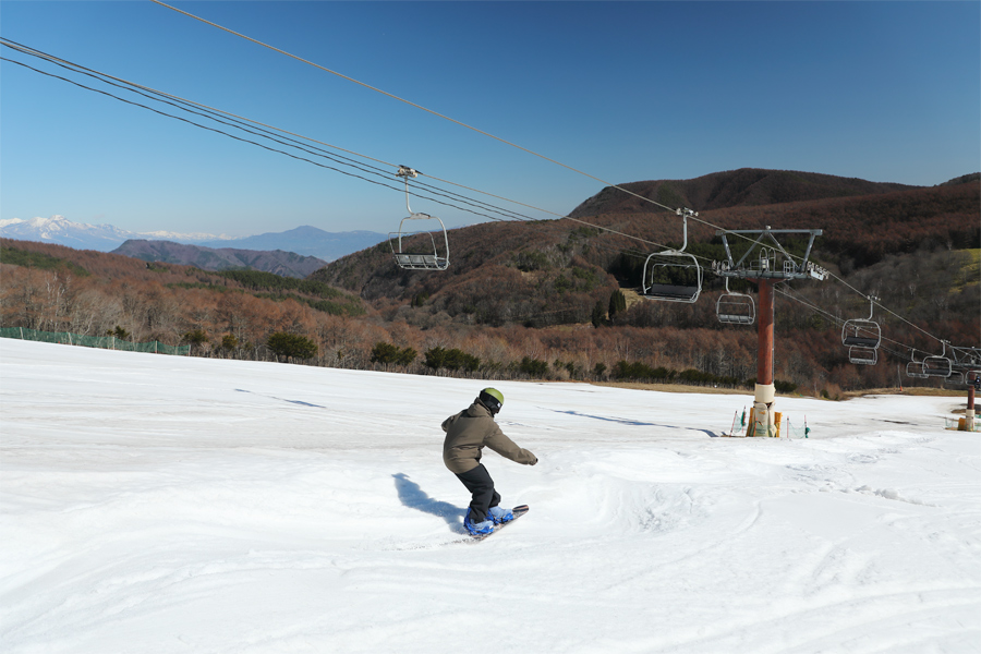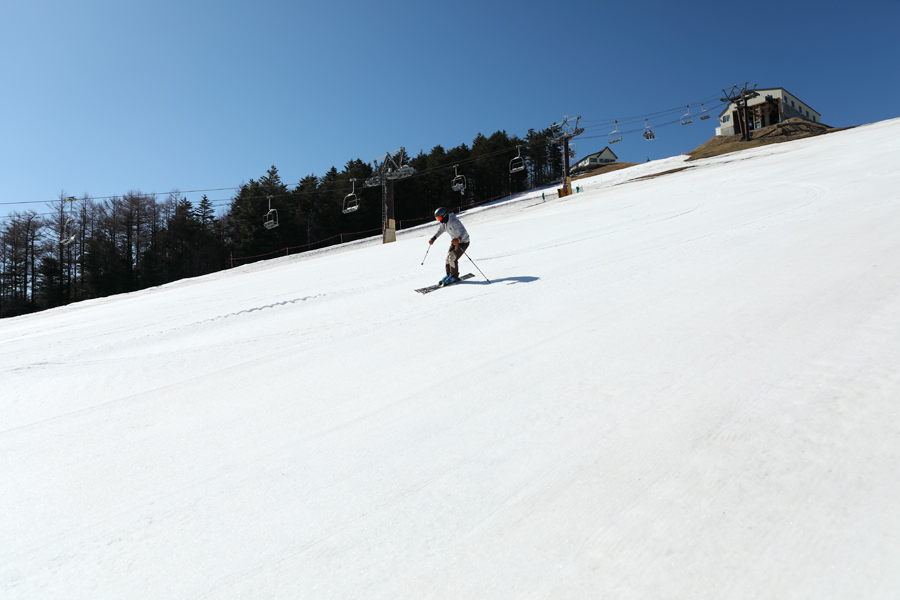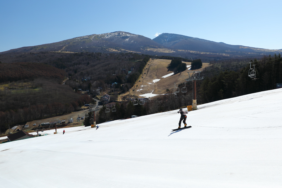 今季の 菅平高原スノーリゾート が今週末4/12(日)までと決まり、菅平ブルー(写真)を望める日も残りわずかとなりました。現在はステージ3リフト1基が動いて、裏太郎のファミリーイースト、ファミリーウェスト、かもしか、太郎山・山頂連絡路の4コースが滑走可能。暖かかったため最初からジャケットを脱いで滑り始めました。