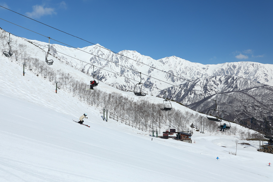 今朝は特にアルペンクワッド→グラートクワッドと乗り継いで登山に向かう来場者が多かったです。「いつも見てます!今日は滑りは無しにして、スノーシューで行けるところまで行ってきます。」とはグラートクワッド乗り場でお会いした愛知県からのご夫婦。ゲレンデでも純白に染まった白馬三山(写真)についつい目が行きました。
