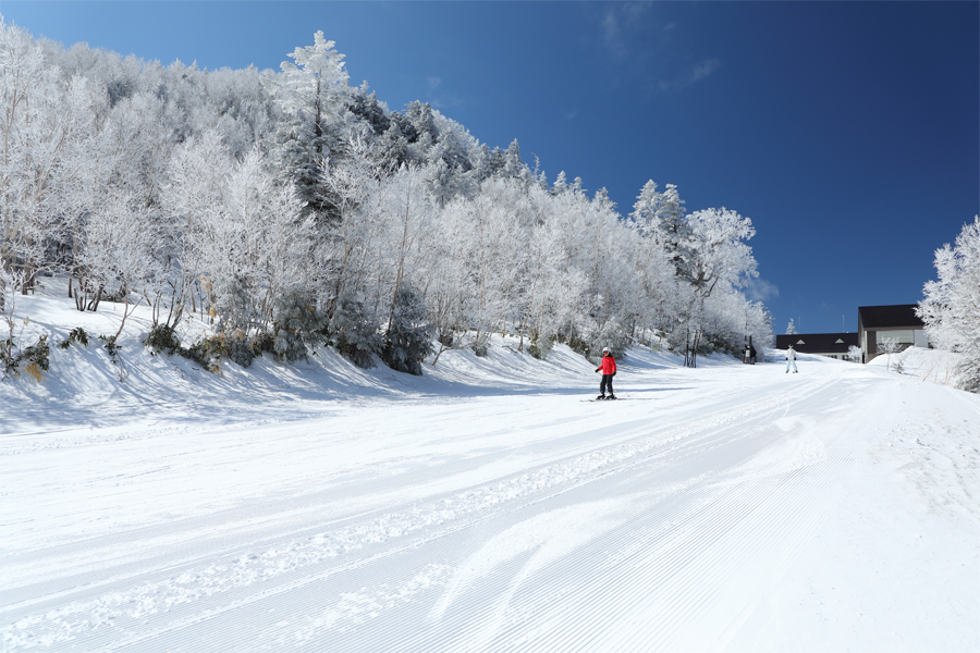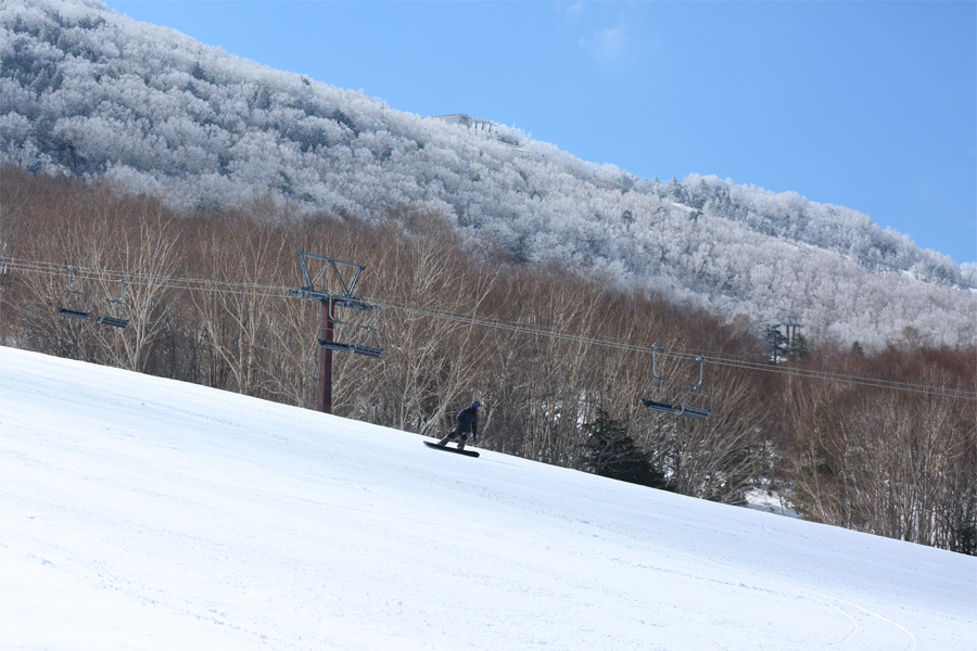 スキー場のスタッフさんが「昨日から薄っすらと雪が積もりました。強く冷え込んだ今朝に圧雪面が硬くなってしまってはいけないと思い、いつもより早くに圧雪作業を行いました。」とお話くださいました。滑り降りて行くにつれて、ザラメ雪比率の高い圧雪バーンへと変わって行きました。
