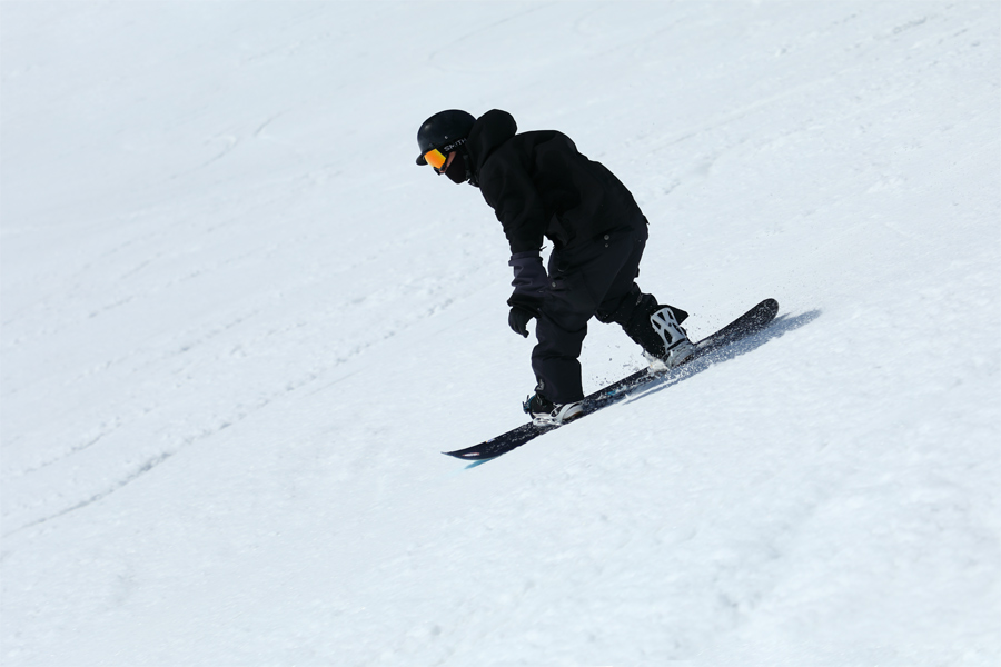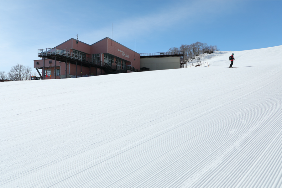 一方、日差しを正面に受ける東向きのグランプリコース(写真)は最初からシャラシャラに緩んだザラメ雪の圧雪でした。8時40分頃には既に深いシュプールがいくつも入っていましたが、跳ね上げられたり、板が取られたりすることはなく、これはこれで滑りやすかったです。