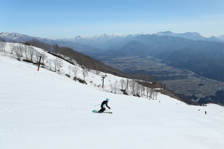 4/7(火)の夕方から夜にかけて雪が降りましたが、4月はここまで平年を4℃近く上回る高い気温となっています。とはいえ晴天日の朝方は放射冷却が効いてヒンヤリ。朝一番のパノラマコース(写真)は適度に締まった滑りやすいザラメ雪の圧雪でした。