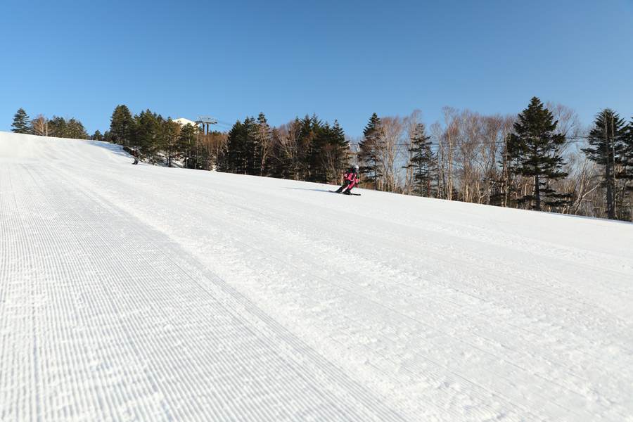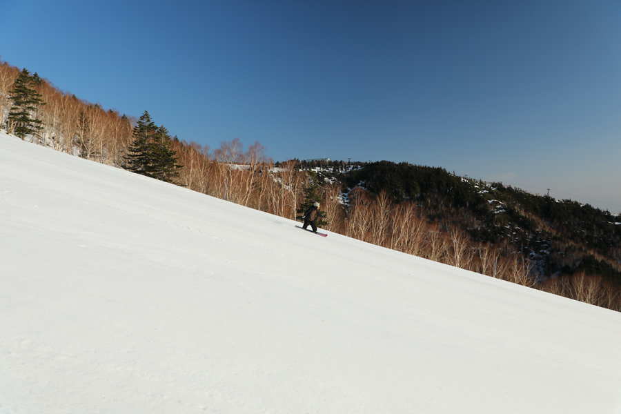 快晴のもと時々吹く強めの南風がひんやりとする朝でした。ジャイアントスラロームコース(写真)は適度に締まったザラメ雪の圧雪。平日とあって超空いていて、第1ゴンドラで2~3本上り返してもコーデュロイ模様の続く最大25度、平均11度、距離2,230mのロングコースを快適に滑れました。