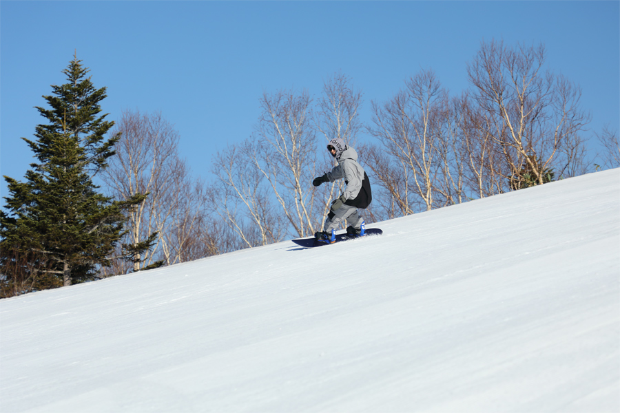 焼額山で目下オープン中のジャイアントスラローム、ゴンドラ迂回、パノラマ(写真)、パノラマイン、サウス、イースト連絡の6コース全てが早朝営業する第1ゴンドラと第2ゴンドラでアクセスできるのもポイントです。埼玉県からのスノーボーダーさん(写真)が「初めて滑りに来ました。とても良いバーンで滑りやすいですね!次回は是非、トップシーズンに滑りに来たいです。」とお話しくださいました。