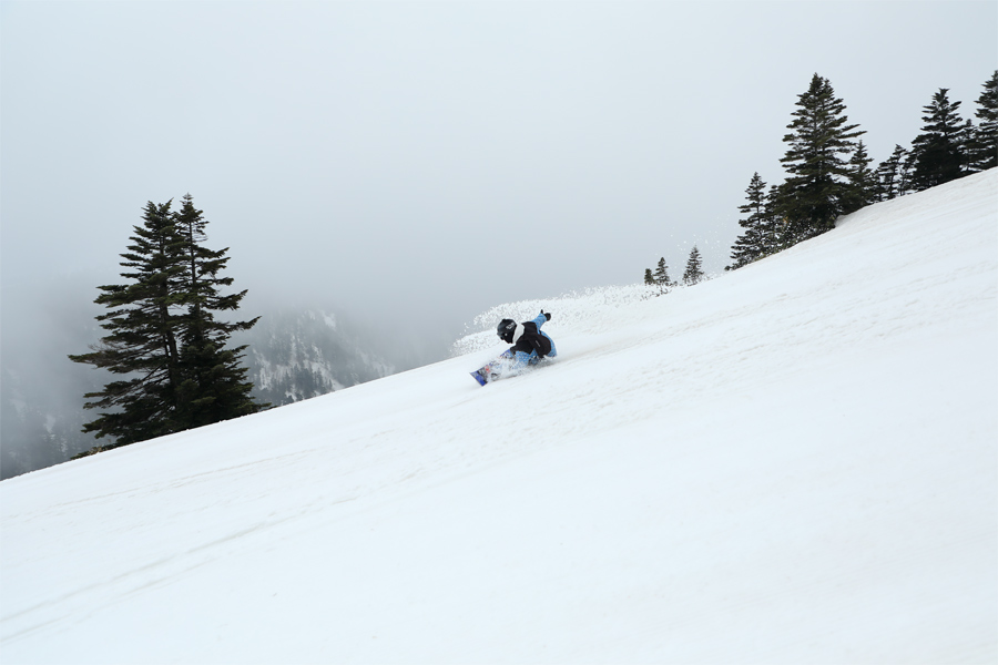 昨日の雨が止み、北寄りの強風に流されて来た雲がゲレンデにかかったり解けたりを繰り返す朝でした。ゲミュートコースは最初からシャラシャラに緩んだザラメ雪の圧雪。勢いよく滑り込んで来られたスノーボーダーさん(写真)が「撮られると思ったら、りきんじゃいましたw」とお話しくださいました。