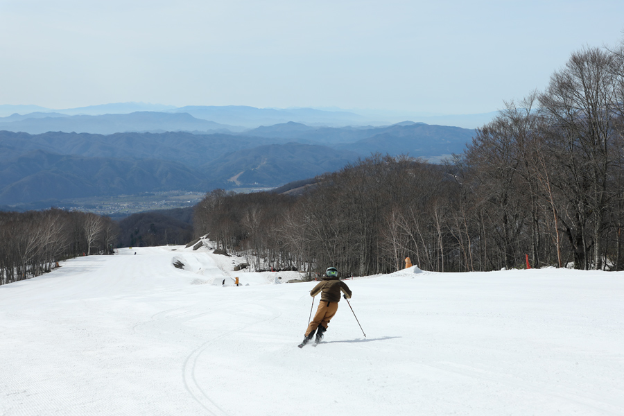 栂の森ゲレンデは適度に締まったザラメ雪の圧雪、ハンの木高速ペア沿い(写真)は緩んだザラメ雪の圧雪。いずれも整備が行き届いて板がよく走り、滑りやすかったです。緩んだ層が厚めで雪面の汚れが目立った御殿場コースでは、少しブレーキが掛かるも林間の静かな雰囲気を楽しめました。写真右手に見える TG PARKS では…