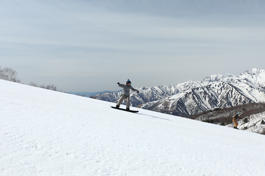 静岡県からのご家族のお母さん(写真左)が「昨日は野沢温泉のスノーパークで遊びましたが、ブレーキが掛かる雪質で、減速してしまって思うように滑れませんでした。今朝の TG PARKS は板の走りが良くてとても良いですね!」とお話しくださいました。9時半頃には緩んだザラメ雪の層がさらに厚くなりましたが、滑りやすいコンディションが続いていました。
