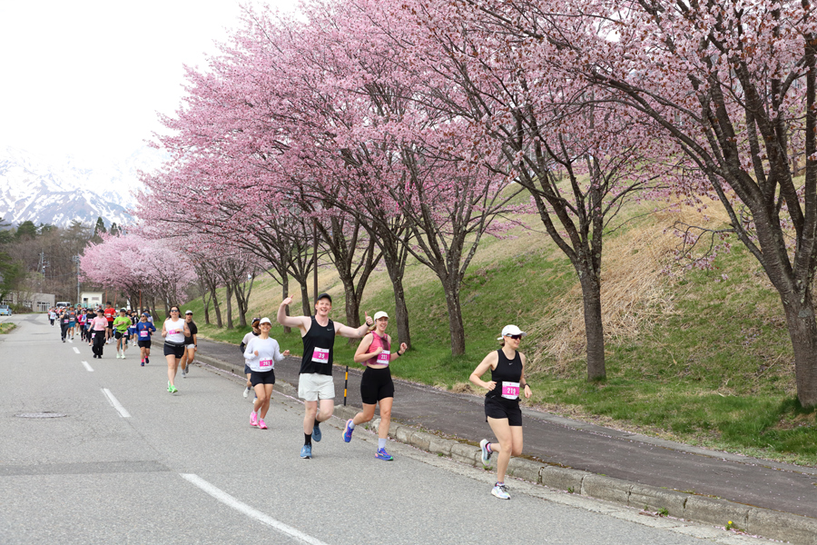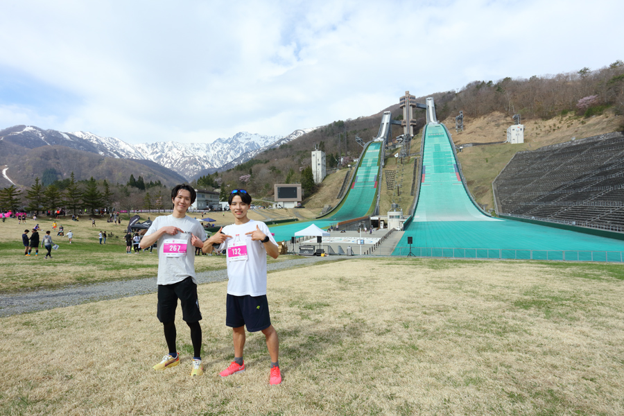 麓では白馬ジャンプ競技場をメイン会場にして、「ハーフマラソン」と「5kmファンラン」の2カテゴリに総勢480名がエントリーした「白馬ハーフ」が開催されました。東京都からのお2人(写真)が「いつも見てます!桜と雪山を楽しみながら走ってきます。1時間50分くらいで走り切れればと思います。」とお話くださいました。