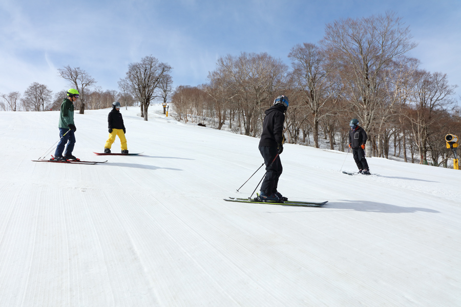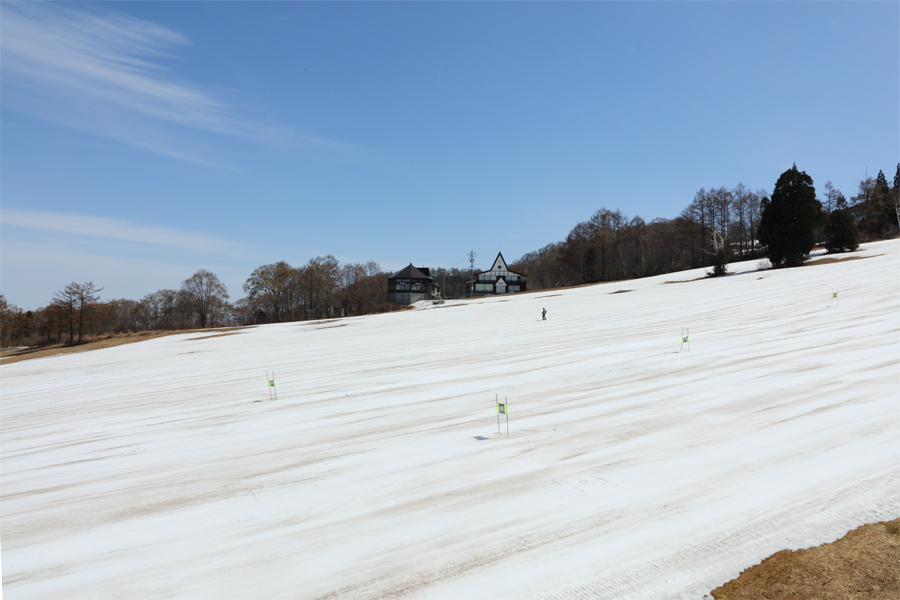 長野市、中野市、木島平村からのシーズン券ホルダー4名様が「残っている雪を楽しみにしてやって来ました。雪がある限り滑りに来ますよ。」とお話くださいました。穏やか&暖かな晴天のもと、やまびこゲレンデDコース(写真)とCコースは最初から緩んでシャラッとしたザラメ雪の圧雪でした。