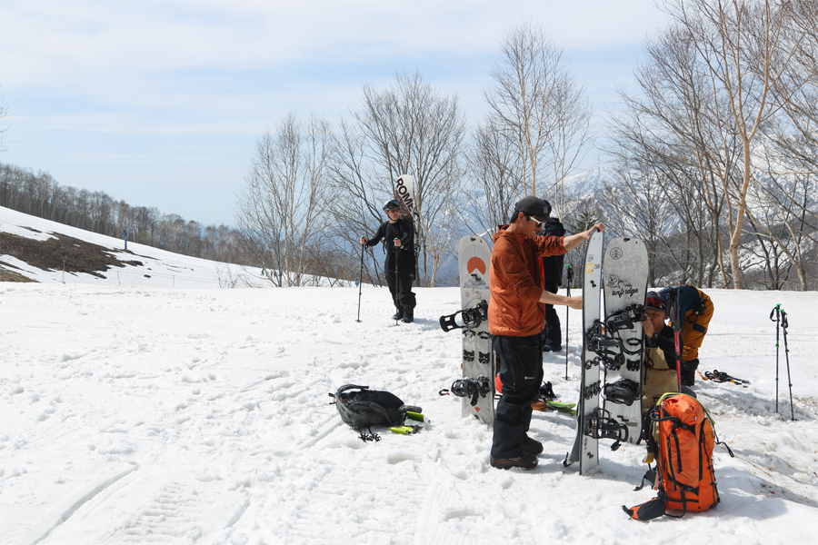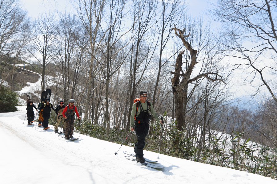 ガイドさんの後に続くお2人(写真)が「いつも見てます。ギアを全てお借りして、天狗原まで行って来ます。板にシールを貼ったりするのも初めてだったので、出発する現段階で既に大汗をかいて暑いです!」とお話しくださいました。また、その後に続く3名様が「初めてのバックカントリーです。つが第2ペアに乗って、ここまで来て、準備しただけでテンションが上がって、もう達成感ありありです。」とお話しくださいました。