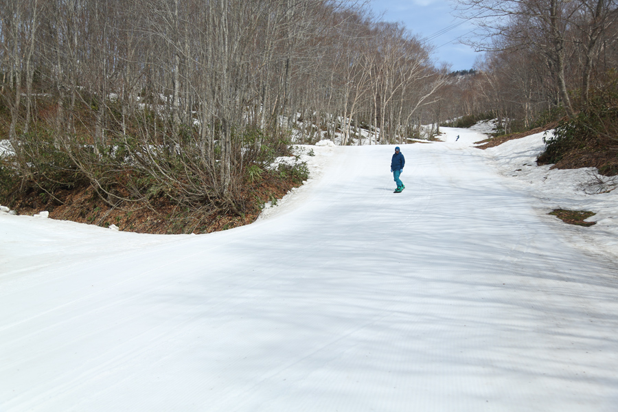 木陰の多い涼しげなコースを滑ろうと御殿場コース(写真)へ。しかし、終盤の緩斜面で板が走りづらくなり、スケーティングを頑張って結局汗だくになりました。ハンの木高速ペア沿いもシャラシャラとしたザラメ雪の圧雪でした。