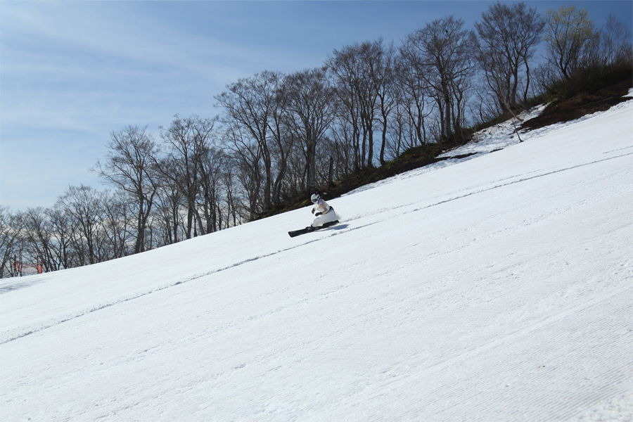 パノラマコース(写真)とルート8上部は最初から緩んでシャラッとしたザラメ雪の圧雪。両コース共にブッシュや積雪の薄い箇所はなく、安心してスピードに乗れました。30分ほどすると緩んだ層が厚くなりましたが、板は走ってくれました。