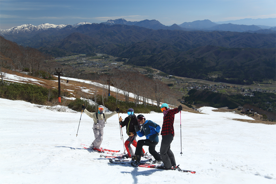 愛知県からの男性(写真左から2人目)が「いつも見てます。五竜47のシーズン券ホルダーです。グランプリコース(写真)が大好きで、ほとんでここで滑っています。今日は圧雪が入ってないですが、思ったより滑りやすいです。」とお話しくださいました。また、他の3名様が「いつも見てます。スキー場で知り合った滑り仲間です。」とお話しくださいました。