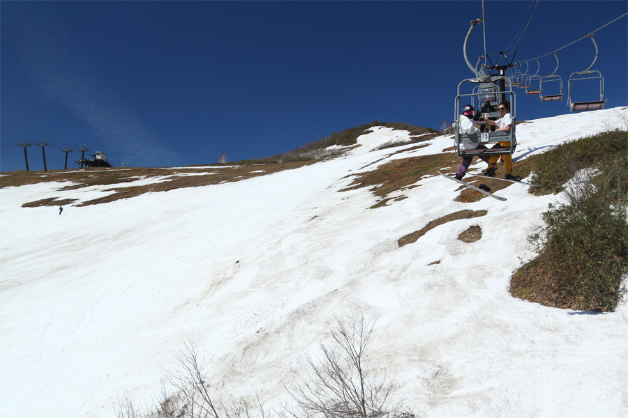 シャラシャラとした非圧雪のグランプリコースでは、融雪が大きく進んで中盤のコース幅が狭くなっていました。しかし、第3ペア乗り場まで板を傷つけることなく滑れました。MIRATORI さん(写真左)と KAGAYAKING の竹内さん(写真右)が「いつも見てます。思ったより滑りやすいですね。」とお話しくださいました。