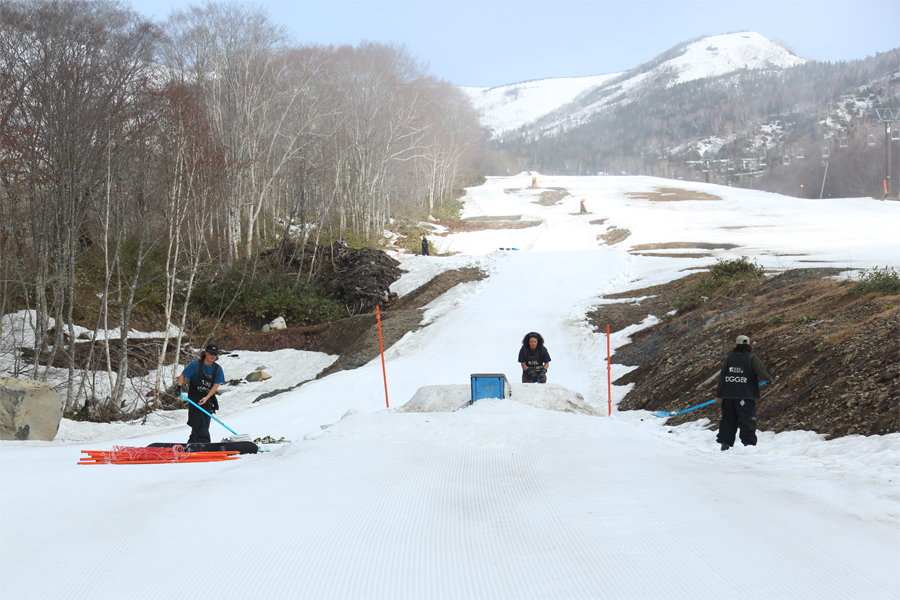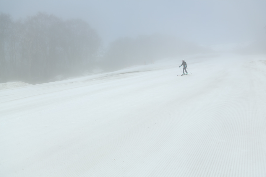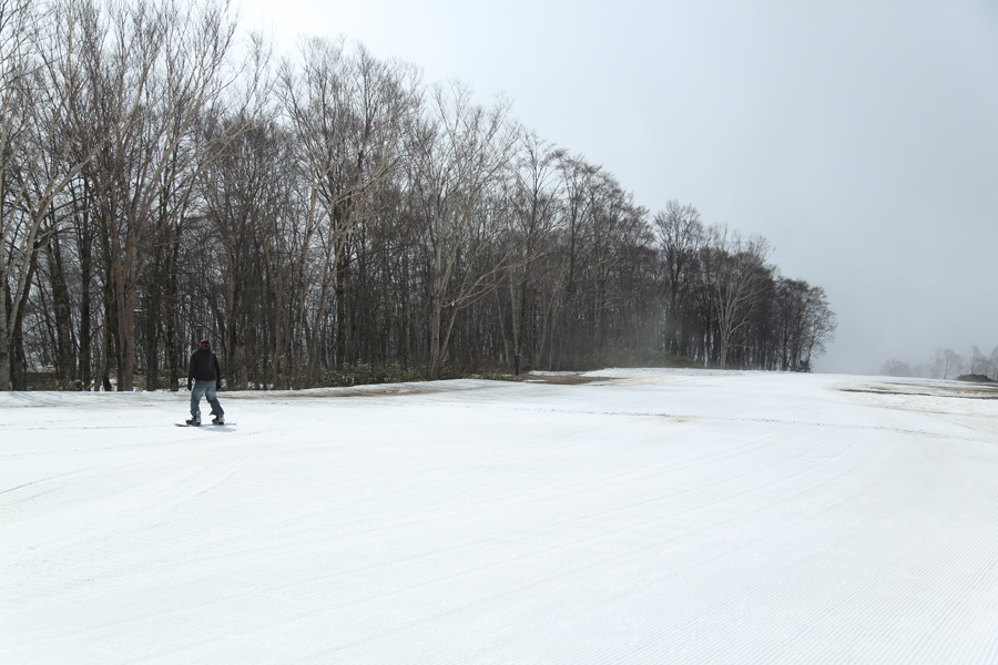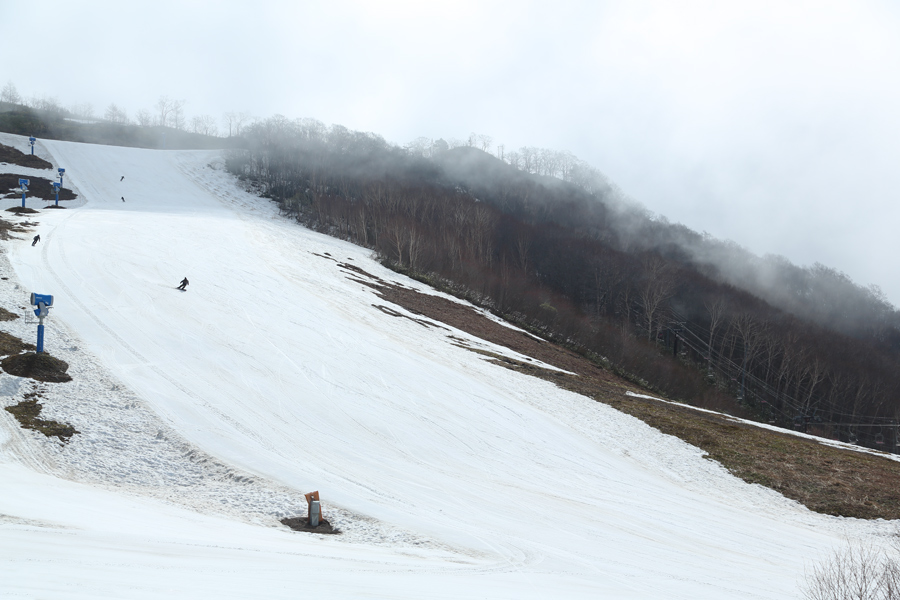 昨日の午前中に降り出した雨が暗いうちに止みました。「ゴールデンウィークまで雪が余裕で持つかなと思っていましたが、気温の高さに加えて、雨と風で一気に融雪が進みました。」とはお会いしたパトロールさん。弱い東寄りの風吹く中、山上にかかっていた濃いガスが徐々に解けて行きました。