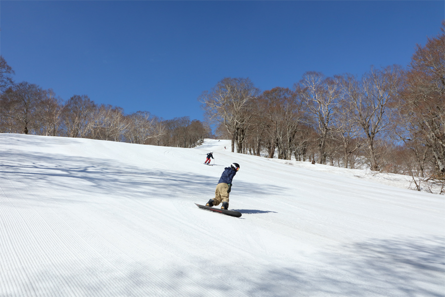 小毛無ゲレンデAコース、Bコース(写真)、上ノ平ゲレンデはシャラッと緩んだザラメ雪の圧雪。いずれでも雪面に汚れが見られましたが、板は走ってくれました。神奈川県と長野県からの3名様が「スノーナビは見たことあります。スノースタントスクートを最初は借りて滑ってましたが、遂に買っちゃいました。」とお話くださいました。