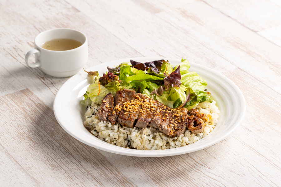 ところで、野沢のゲレンデレポートは今回が最終回となります。レポーターは締めのランチに、今季も一番人気だった レストハウスやまびこ の「野沢菜ガーリックステーキライス」(写真、スープ付、2,100円)を頂きました。オーダーが入ってから焼かれる赤味肉のステーキ(120g)に、ニンニクたっぷりのガーリックソース、野沢菜入りのライスの相性が抜群で、美味しかったです!