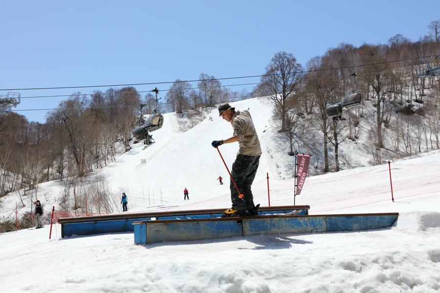 4/21(火)からはやまびこB終盤の左側にハイクアップパーク(写真、BOXとレール)、やまびこC終盤の左側にスノーランプが設置されています。長野市からのスキーヤーさん(写真)が「いつも見てます!繰り返し練習するしかないですね。若い子が羨ましいです。」とお話くださいました。